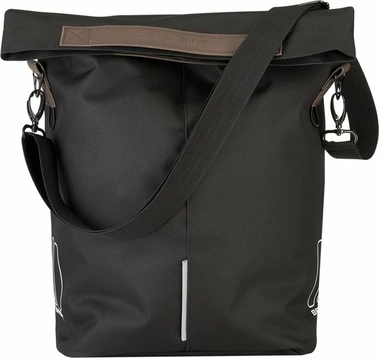 De Basil City Shopper: de ideale fietsshopper die past bij het uptempo van de city. Werk, vrienden, uitgaan, naar de markt of juist even helemaal zen na een uurtje yoga. Deze zwarte shopper is niet te zwaar, niet te groot en toch ruim (maar liefst 14 tot 16 liter) en sterk genoeg om flink wat spulletjes of boodschappen in mee te nemen. De tas heeft een waterkerende vouwsluiting met magneet en voorkomt daarmee inregenen. Deze zwarte tas bevestig je makkelijk aan de bagagedrager van je fiets of hang je gewoon nonchalant over je schouder met de afneembare schouderband. Dankzij de vegan leder handgrepen draag je de tas comfortabel. De tas heeft een binnenvak met rits en een bevestigingsmogelijkheid voor LED-verlichting. Eigenschappen: Je draagt de City shopper aan de vegan leder handgrepen of met de afneembare schouderband. Met het Hook-On systeem bevestig je de shopper snel achterop jouw fiets. Dankzij de reflectie op alle zijden ben je beter zichtbaar in het donker.