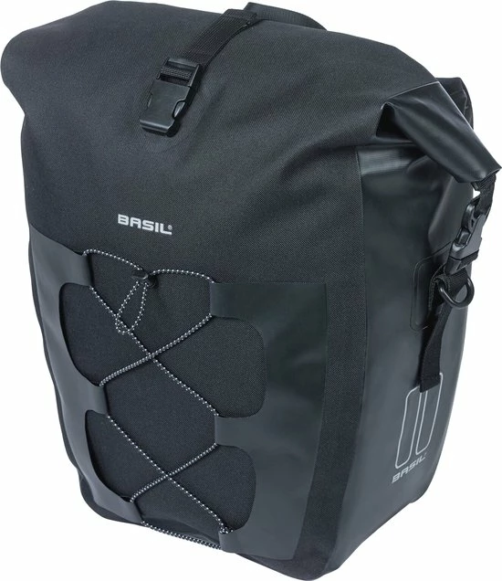 De Basil Navigator Waterproof L is een enkele fietstas voor achterop een dames- of herenfiets. De sportieve zwarte tas heeft een inhoud van 25 tot 31 liter.