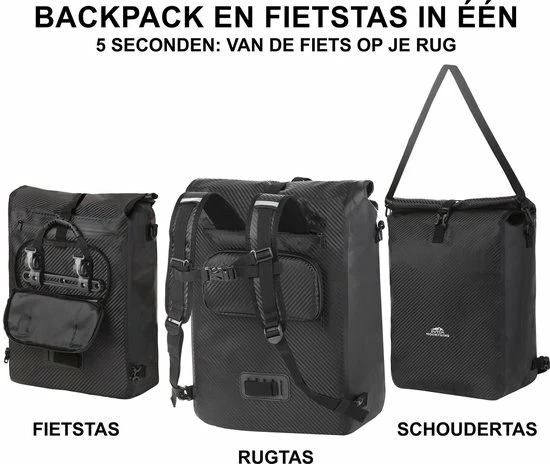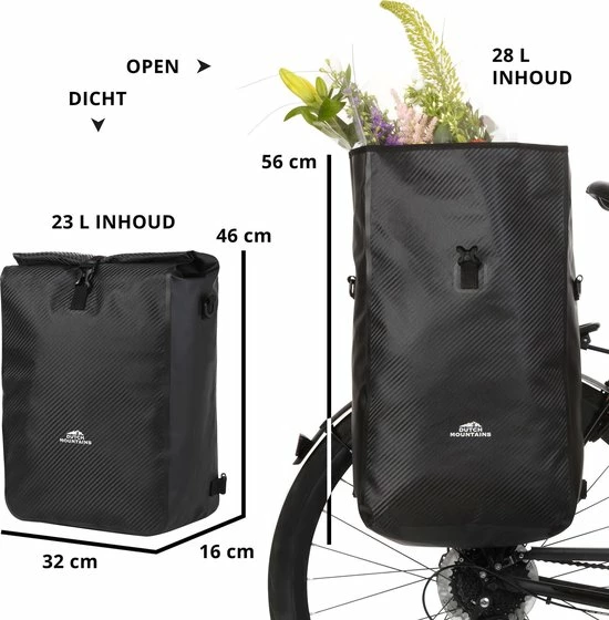 ? Sterk. ? Sportief design. ? Volledig waterdicht. ? Supereenvoudig in gebruik. De nieuwe Dutch Mountains Fietstas combineert maximale duurzaamheid met een lekker sportief design ?n alledaags gebruiksgemak. Gebruik hem eenvoudig op een reguliere fiets, een elektrische fiets of een sportfiets; ook in de meest uitdagende (weers-)omstandigheden geeft deze beresterke fietstas van hoogwaardig tarpaulin geen krimp. In letterlijk seconden klik je hem met het Quick Lock systeem op je bagagedrager, links of rechts. Nooit meer gedoe met spanbanden of ingewikkelde klemmen!