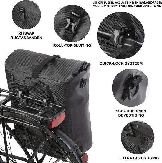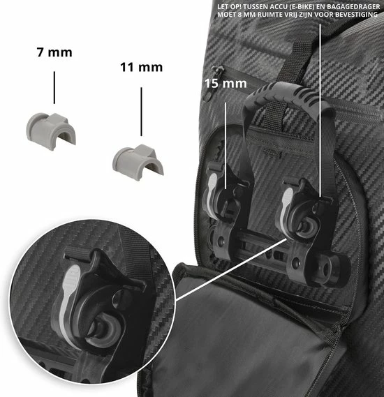 ? Geschikt voor reguliere fietsen, sportfietsen en de meeste elektrische fietsen (indien 8MM ruimte tussen bagagedrager en accu)!