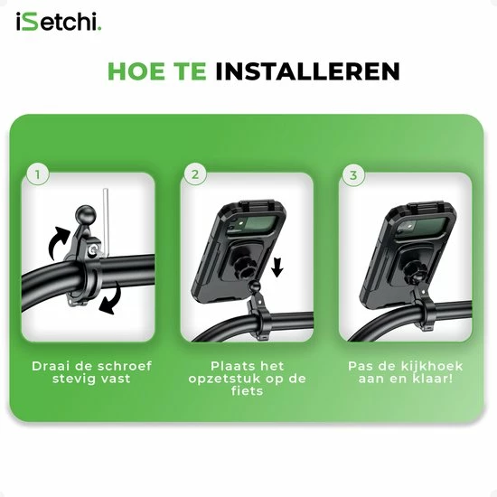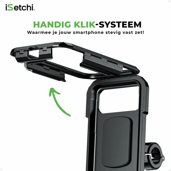 De iSetchi waterdichte telefoonhouder voor op de fiets is eenvoudig te monteren. De metalen stuurstang zorgt voor een stevige fiets-stuur bevestiging en de meegeleverde spiegel-bevestiging zorgt ervoor dat de telefoonhouder op elke motor of scooter bevestigd kan worden. Plaats je Smartphone op de telefoonhouder, druk de drie klemmen vast en fietsen maar! Verder zorgt de vorm van de telefoonhouder ervoor dat de telefoon niet trilt tijdens het fietsen. De rubberen binnen-voering zorgt voor een anti-schock effect en een krasvrije telefoon.