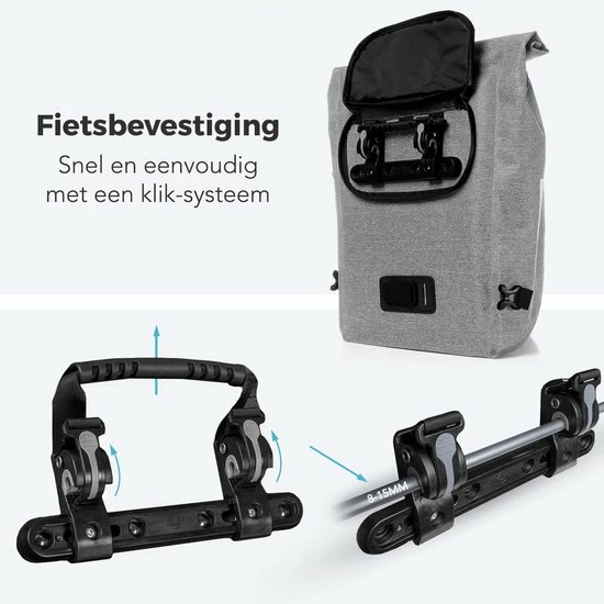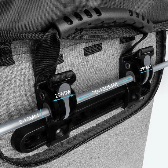 De LifeGoods Fietstas heeft verschillende opzetstukken. Zo past hij op elke bagagedrager, of het nu gewone fietsen of e-bikes zijn! Voor grote bagagedragers (15 mm doorsnee) heb je geen opzetstuk nodig. Gebruik het blauwe opzetstuk voor middelgrote bagagedragers (doorsnee van 11 mm). Het grijze opzetstuk werkt goed voor kleine bagagedragers (doorsnee van 8 mm).
