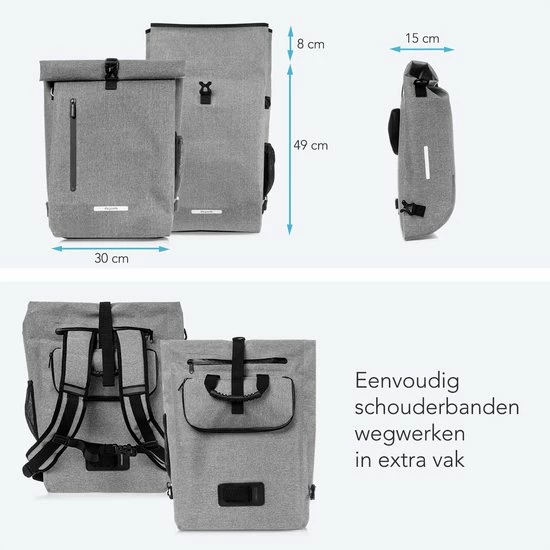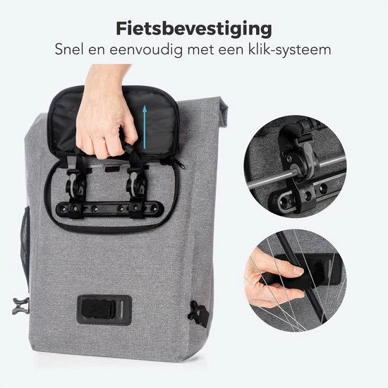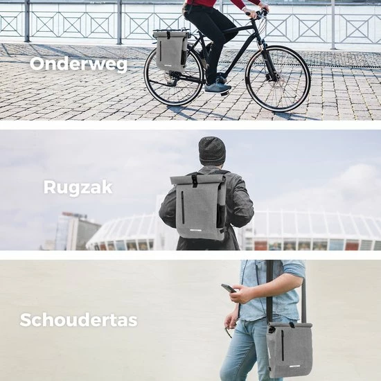 Fietstas, rugtas en schoudertas, de LifeGoods Fietstas is het alledrie in ??n! Met de bijgeleverde opzetstukken past de fietstas op elke bagagedrager. Of het nu gewone fietsen of e-bikes zijn. Met een inhoud van 25L is de tas perfect om lunch mee te nemen op lange fietstochten. Door het draaggewicht van 10 kg kan je er makkelijk al je werkspullen in kwijt. De tas is 100% waterproof en houdt je spullen droog als het regent. Met de 3-in-1 LifeGoods Fietstas heb je altijd de perfecte tas bij de hand.