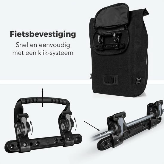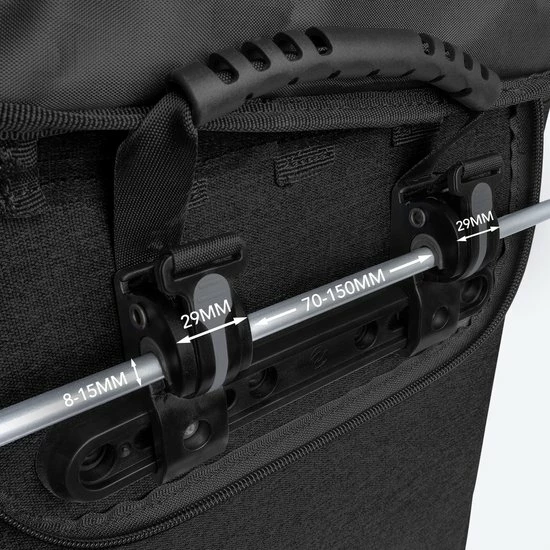 De LifeGoods Fietstas heeft verschillende opzetstukken. Zo past hij op elke bagagedrager, of het nu gewone fietsen of e-bikes zijn! Voor grote bagagedragers (15 mm doorsnee) heb je geen opzetstuk nodig. Gebruik het blauwe opzetstuk voor middelgrote bagagedragers (doorsnee van 11 mm). Het grijze opzetstuk werkt goed voor kleine bagagedragers (doorsnee van 8 mm).