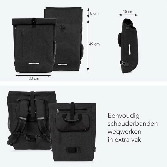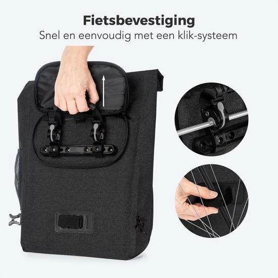 Fietstas, rugtas en schoudertas, de LifeGoods Fietstas is het alledrie in ??n! Met de bijgeleverde opzetstukken past de fietstas op elke bagagedrager. Of het nu gewone fietsen of e-bikes zijn. Met een inhoud van 25L is de tas perfect om lunch mee te nemen op lange fietstochten. Door het draaggewicht van 10 kg kan je er makkelijk al je werkspullen in kwijt. De tas is 100% waterproof en houdt je spullen droog als het regent. Met de 3-in-1 LifeGoods Fietstas heb je altijd de perfecte tas bij de hand.