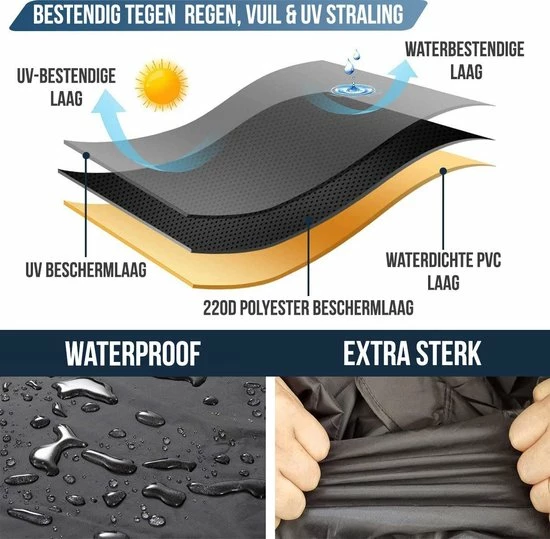 De hoes is water & wind bestendig. De hoge kwaliteit naden weerstaan zelfs de hevigste stormbuien en voorkomen dat je fiets nat wordt of dat de hoes scheurt.