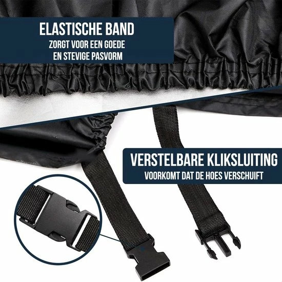 Door de elastische band en klikgespen sluit de hoes altijd mooi aan op elke soort fiets. Dit zorgt voor een mooiere pasvorm en voorkomt dat de hoes wegvliegt door de wind.