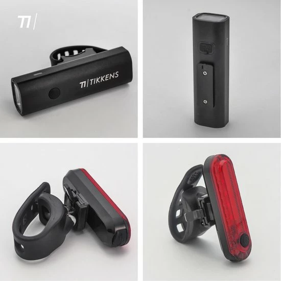 Voel je veilig op de fiets met de TIKKENS LED fietslamp set. Deze set bestaat uit een voorlicht ?n achterlicht. Beide lampen zijn waterbestendig, lichtgewicht en duurzaam. Je kan ze opladen via USB-kabel, dus geen gedoe met batterijen. Ook te gebruiken bij andere activiteiten, zoals voor racefiets verlichting, hardlopen, kamperen of bij het uitlaten van de hond. Met een batterijduur van 4 tot 12 uur en een accu indicator, zodat je weet wanneer je ze terug moet opladen. Zowel voor- als achterlicht hebben diverse lichtstanden. Zien en gezien worden!
