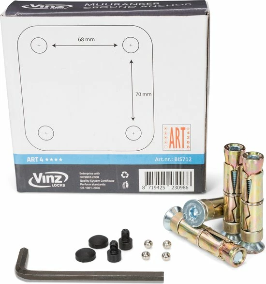 Het VINZ muuranker wordt geleverd met bevestigingsmateriaal dat bestaat uit 4 pluggen, 4 bouten en 4 zekeringskogels. Tevens wordt er een imbus sleutel meegeleverd. Het anker is makkelijk te bevestigen met meegeleverde instructies.